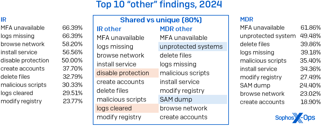 The final comparison looks at the “other” category, in which we group techniques and traces that don’t fall into the other two categories. The top 10 had an 80% overlap in IR and MDR cases; creating accounts, deleting files, installing services, malicious scripts, and modifying the registry were the dominant techniques, as shown in Figure 6. Others, such as SAM (Security Account Manager) dumping, were more common in one team’s dataset.