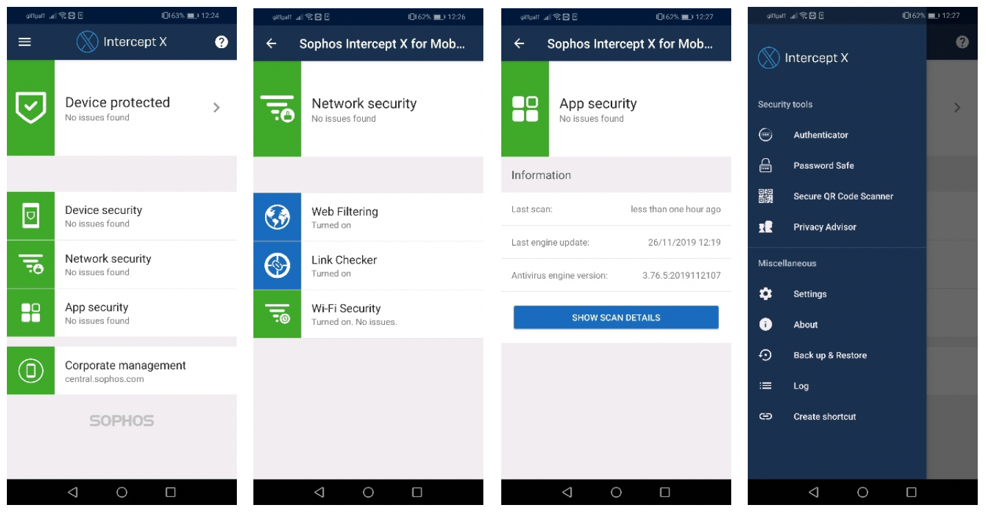 According to a recent survey of 3,100 IT managers, 10% of all threats are discovered on mobile devices. Sophos Mobile includes Intercept X for Mobile, protecting devices against malware, network attacks, and malicious web traffic. Intercept X for Mobile also includes easy-to-use security tools right at your fingertips, like the Authenticator, Password Safe, Secure QR Code Scanner, and Privacy Advisor.