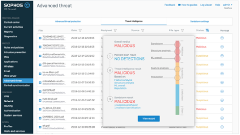 When XG Firewall’s Xstream DPI engine performs AV analysis on a file entering the network and determines there is active code, it holds the file temporarily and sends it to the SophosLabs Intelix service in the cloud for both static and dynamic (sandbox) analysis. It then provides a detailed overview of the results and only releases the file to the downloader or email recipient if the file is declared safe.
