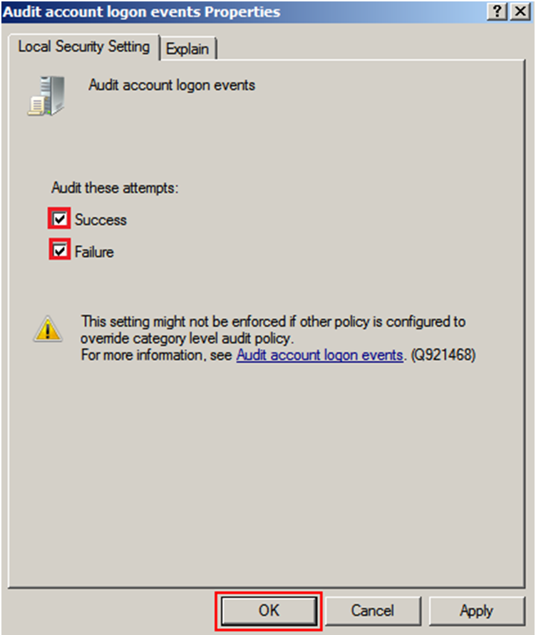 From each of the Active Directory Servers, go to Start > Administrative Tools > Local Security Policy to view Security Settings. Browse to Security Settings > Local Policies > Audit Policy and double click on Audit account logon events to view the Audit account logon events Properties window. Alternatively, use a Group Policy Object (GPO) to achieve the same thing across multiple servers.