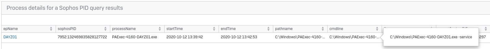 This process was launched at 2020-10-12 13:39:43, and you can use this to trace back to the offending root cause. To do this there is a great query written by Karl Ackerman from our Product Management team. You will find it here: https://community.sophos.com/intercept-x-endpoint/i/query-forum/live-discover—lateral-movement-detection