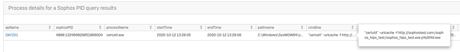 Now, you can see that certutil created this file. Now you have the SophosPID: 4888:132469828851869004. This is a unique identifier that can be used to call information about a process from our Data Recorder service, this goes back up to 90 days. Using the next query “Process details for a Sophos PID” you can see how certutil (the cmdline) and what launched it (parentSophosPID).