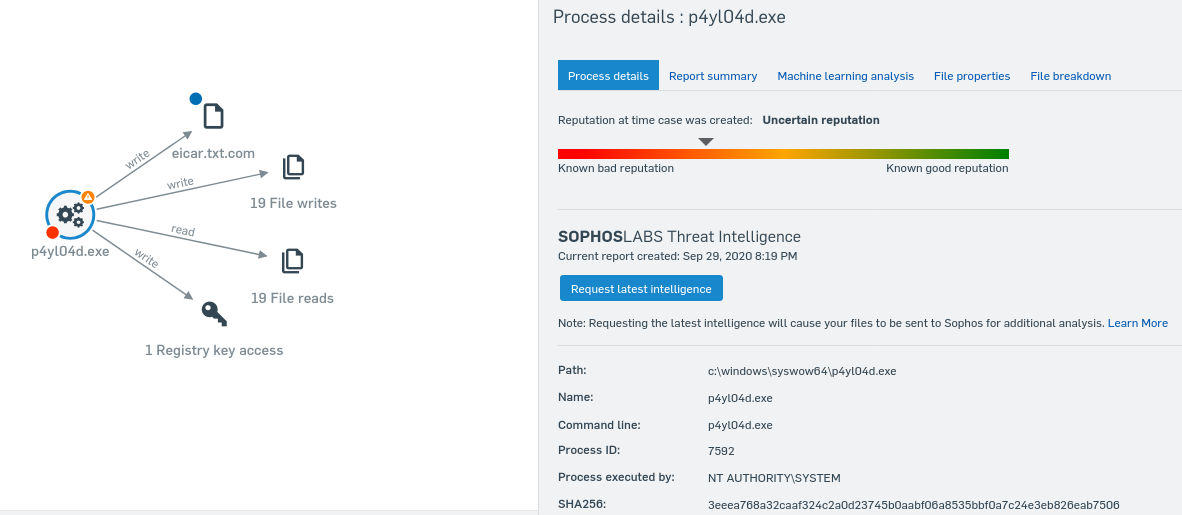 This command is going to run paexec.exe and create a new service on the remote machine. It will ask for the admin password – although you can hard code that with text files if you wish to. The command that it is going to run will execute cmd.exe as NT AUTHORITY\SYSTEM, make it run certutil.exe to download the EICAR file from sophostest.com. The file name will be p4yl04d.exe. To make sure that step works, run a quick file checksum. It finally runs the p4yl04d.exe again, as SYSTEM.