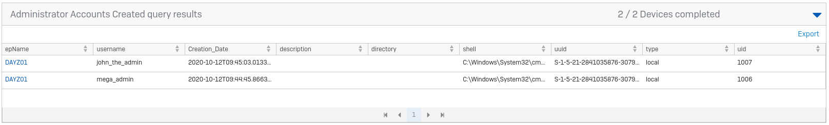 Yes! Ok, now what? You have a brute forced admin account, and a tool you can use to spread a payload across the network. The first thing I would be doing as an attacker is creating some more credentials, someone might notice that admin account has been broken into. There are built-in queries to show you all the user accounts on a device, but that could make for a long list. Instead I have written a query that looks for newly created admin accounts: