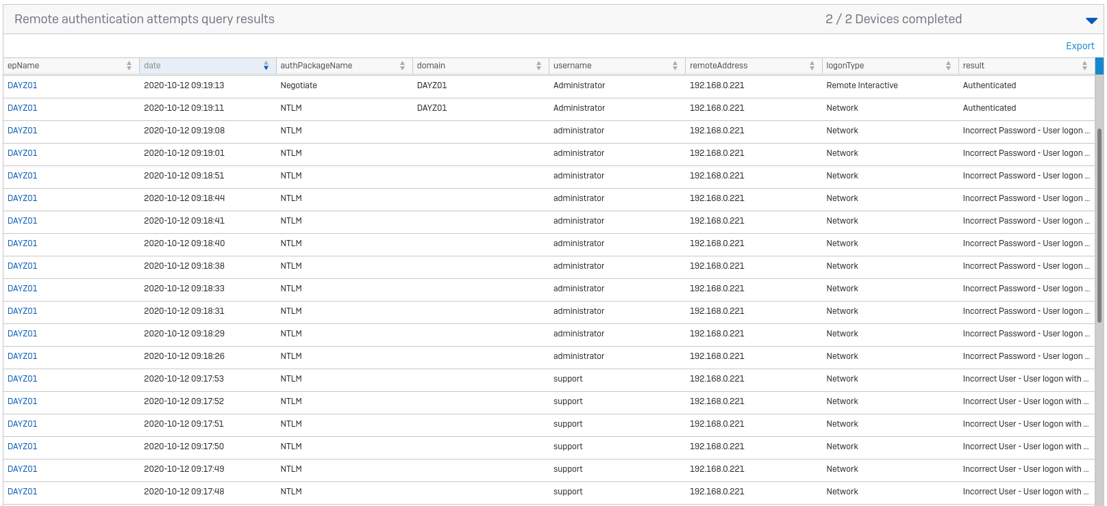 That noise should create failed logins locally on the devices, and on the domain controller. This is something you can query. Log into Central > Threat Analysis Center > Live Discovery, select all the machines in the demo estate and choose the query “User: Remote authentication attempts”. You should see plenty of failed login attempts, trying different username combinations. I would suggest finishing with a successful login to suggest that the attacker has got onto the machine and now knows a username and password:
