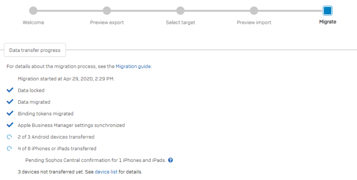 The Sophos Mobile migration tool lets on-premise customers migrate to Sophos Central and benefit from all the goodness inside our unified cybersecurity platform. There’s no need to re-enrol devices, and users and policies are all transferred during the process. A migration wizard takes admins through the steps and highlights any warnings or blockers.