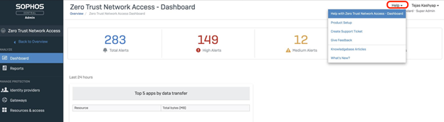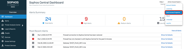 You can then login to your Sophos Central account and join the Early Access Program for Sophos ZTNA (accessed via the upper right menu under your account login name)…