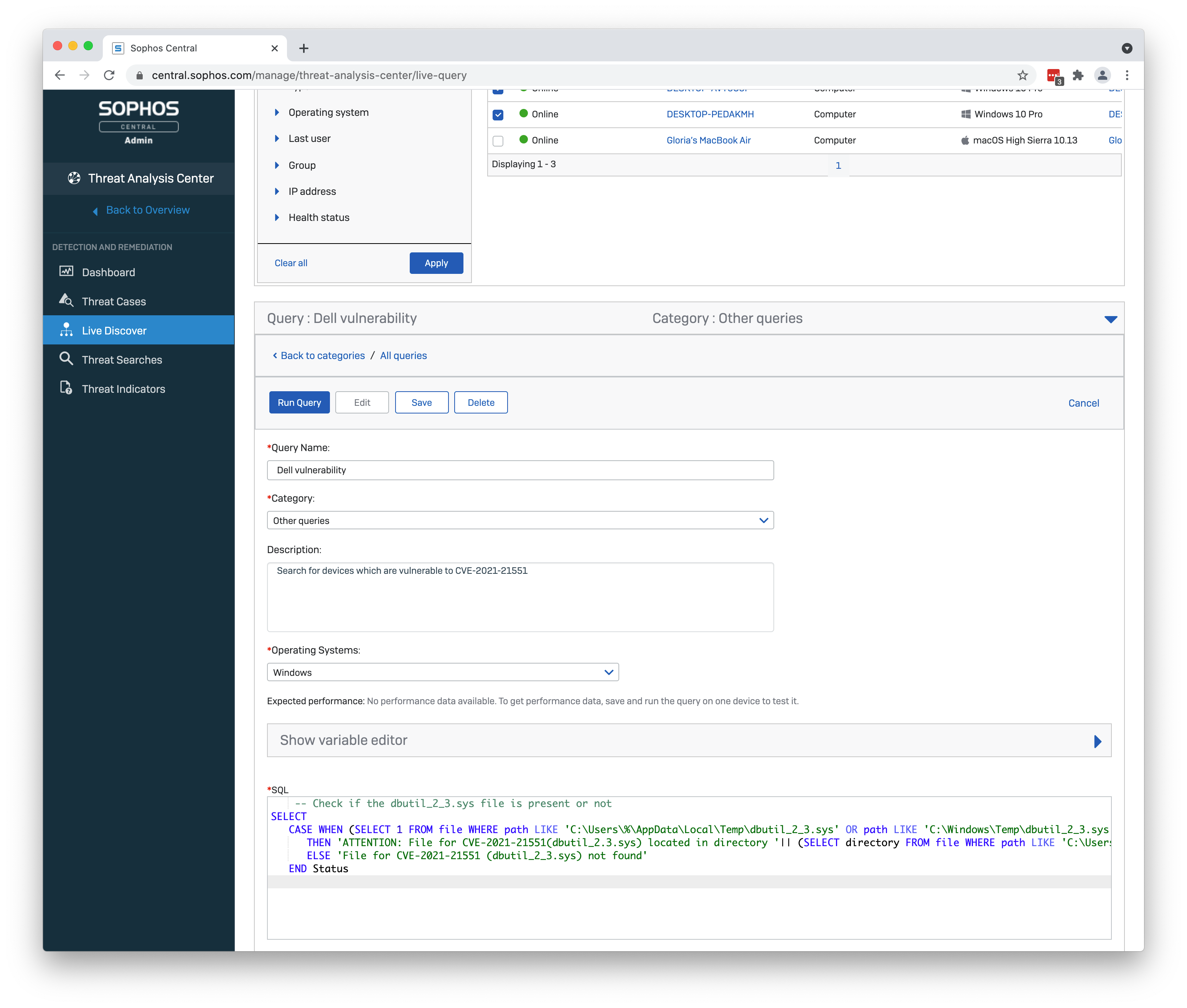 Sophos Endpoint Detection and Response (EDR) makes it easy to identify whether you have the file associated with this vulnerability on a device, and how many devices have that file. This allows you to focus remediation efforts and quickly address the issue.