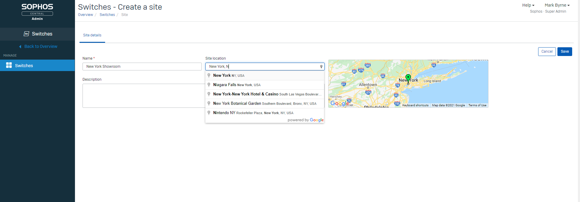 Unboxing the switch and connecting it is straightforward enough. Logging into your Sophos Central portal, the first stage of setting up the switches is to define the site (or sites) being managed. Sophos Central organises switches into sites which can be created either by using the “Getting Started Wizard” or by clicking the “Add site” button and giving the site a name and optional map location.