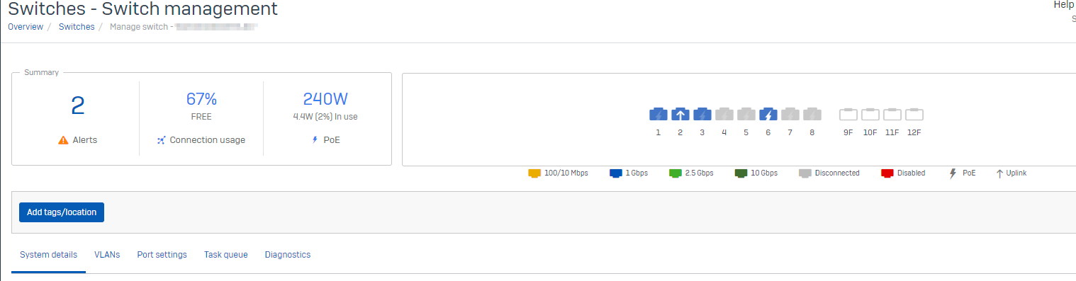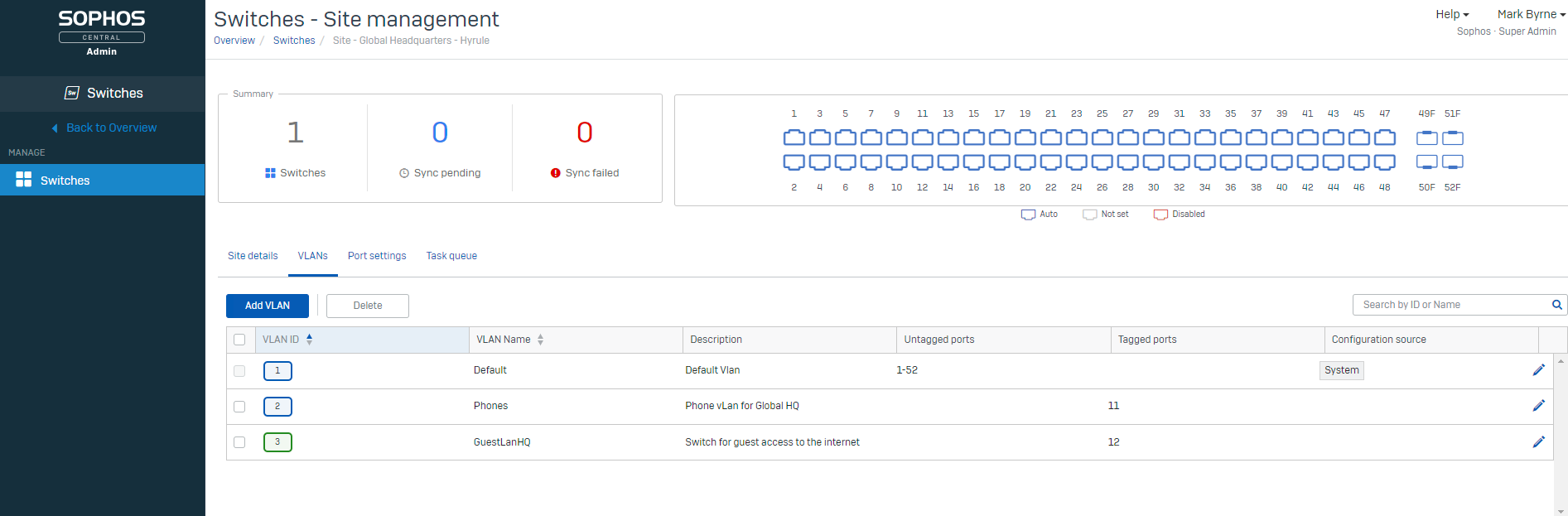 Sophos Central also allows VLAN and port configuration per switch, as well as providing a graphical display of the current switch configuration and POE settings.