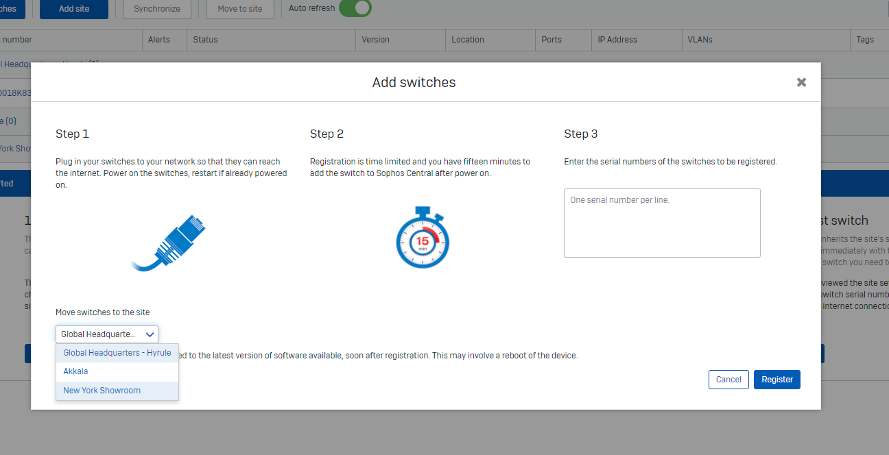 Adding a new switch is, again, simple enough. This can be done by selecting the switches menu on the left and clicking the “Add Switch” button. Then you just need to enter the serial number of the device and click “Register”, Sophos Central then waits for the switch to be powered on. This is pretty much identical to the Wireless setup and so should be familiar to anyone with experience with our APX access points. The switch only needs an internet connection, and it will register with Sophos Central and immediately download the latest firmware and any VLAN configurations for the current site.