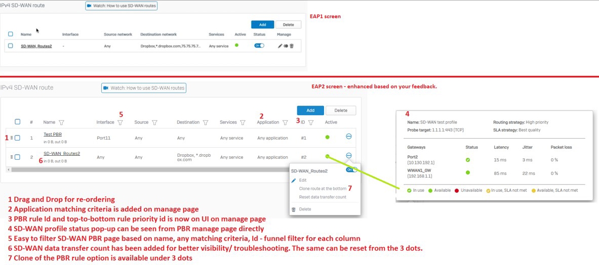 - Several SD-WAN Policy Based Routing (PBR) enhancements for usability and trouble-shooting based on early EAP feedback (see image below for a list of enhancements in this area)
