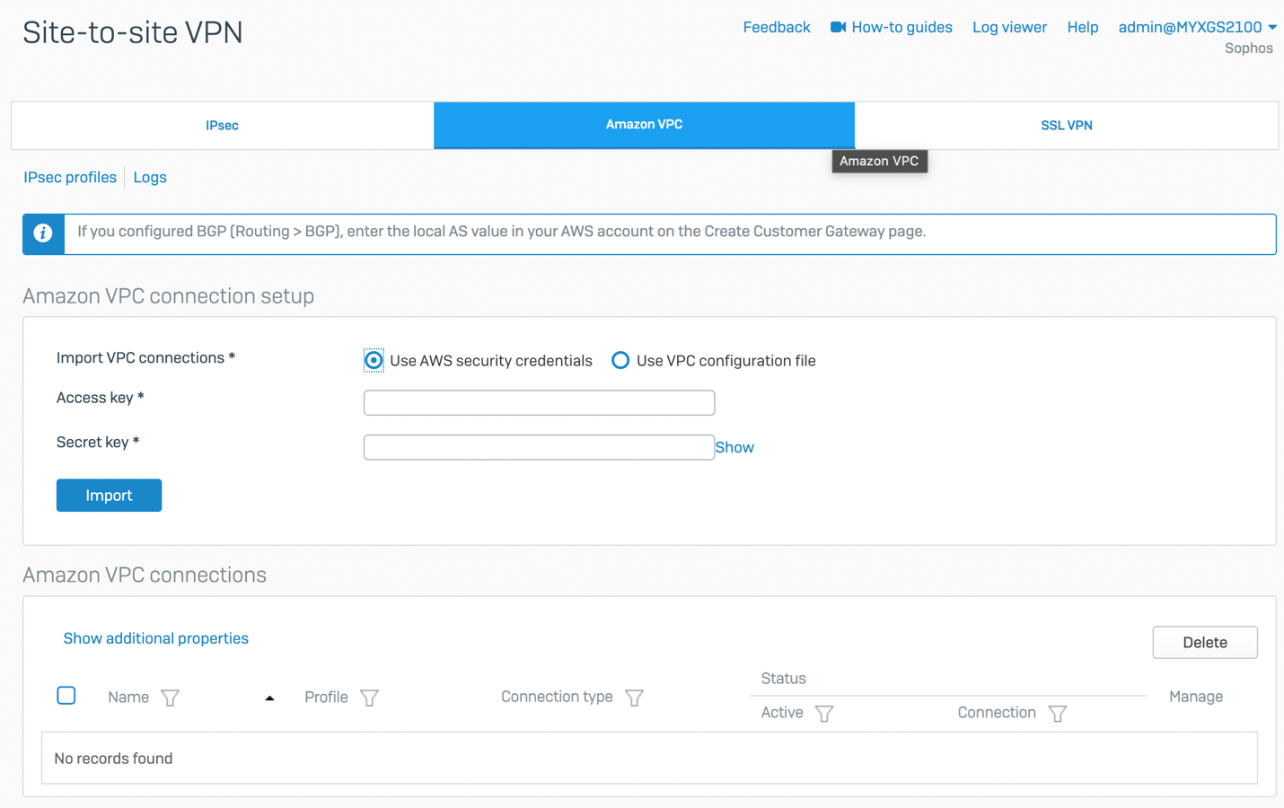 The new AWS VPC import feature enables the easy connection of your on-premise firewall to your AWS network infrastructure. You can now import the VPC configuration XML file from AWS to automate the tunnel setup on your Sophos Firewall including related routing and the associated IPsec policies. There is a new tab in the VPN section of the product for importing, monitoring and managing your AWS VPC connections.