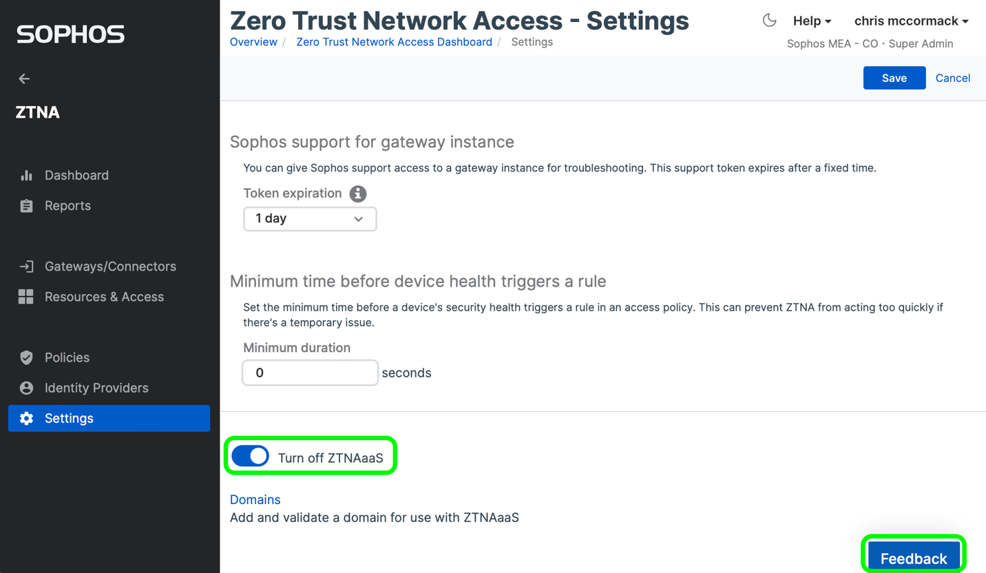 Then for ZTNAaaS, as highlighted below, from the Settings screen under ZTNA, make sure you Turn On ZTNAaaS, and use the Feedback option within Sophos Central to leave your feedback or report any issues.