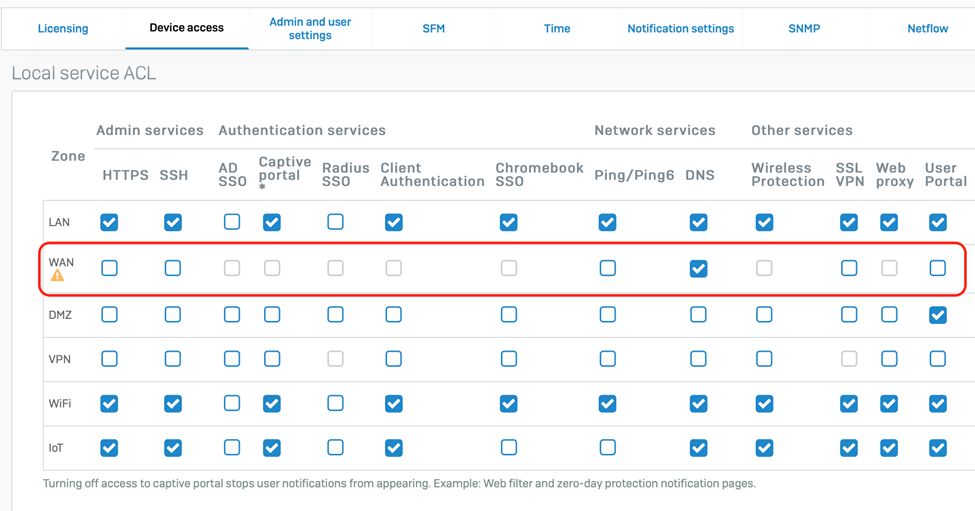 Sophos Firewall offers a number of ways to limit access to services that are not required to reduce exposure on the WAN. You should periodically check the device access settings and ensure that all unnecessary services are disabled (unchecked) on the WAN (see screen shot below). In particular, it’s strongly recommended that you disable remote admin via HTTPS and SSH, as well as the Captive Portal and User Portal on the WAN. Use Sophos Central, VPN or ZTNA to manage firewalls remotely. See the product documentation for instructions on how to manage device access.