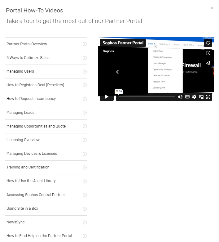 To help you get started in a flash, we offer a number of how-to videos covering the most important Sophos Partner Portal features. In the partner portal, just click on the (?) icon at the top right corner to access these videos.
