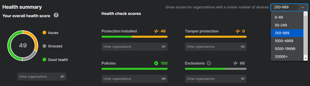 In the example below, the customer has an overall score of 49 which is well below the average score of 97. Customers can also compare each of the individual health check scores (e.g., protection installed, policies) to identify where to focus. The drop-down on the right enables users to select their desired comparison cohort.