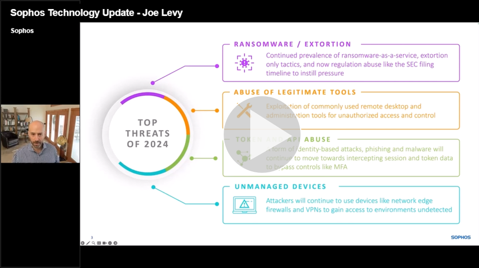 Join Joe Levy, Sophos President and Acting CEO, for an insightful review of recent innovations and a sneak peek into what’s ahead to ensure you stay ahead of hackers and keep your customers secure. Joe discusses the latest updates in our SecOps, Endpoint, Network, and Cloud Security offerings, to help you win business now and strategize for the future.