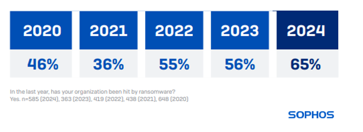 65% of manufacturing and production organizations reported they were hit by ransomware last year. This is a notable increase from the previous two years (56% in 2023 and 55% in 2022) and represents a 41% increase since 2020.