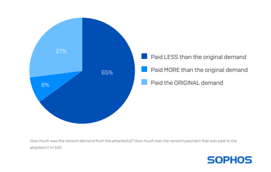 While the ransom payment has increased, only 27% of manufacturing victims said that their payment matched the original request. 65% paid less than the original demand, while only 8% paid more.