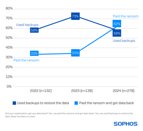 While 58% in manufacturing restored encrypted data using backups, 62% paid the ransom to get data back. The percentage of manufacturing organizations that paid the ransom has almost doubled from our 2023 study when the sector reported one of the lowest ransom payment rates (34%) across all sectors.
