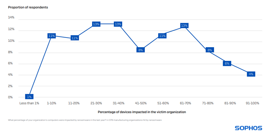 On average, 44% of computers in manufacturing and production are impacted by a ransomware attack. Having your full environment encrypted is extremely rare, with only 4% of organizations reporting that 91% or more of their devices were impacted.