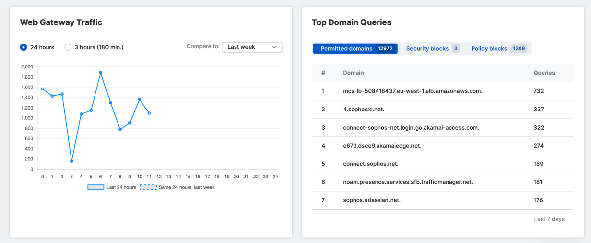 Sophos DNS Protection also provides in-depth visibility into the domains visited from your network with comprehensive dashboarding and reporting.