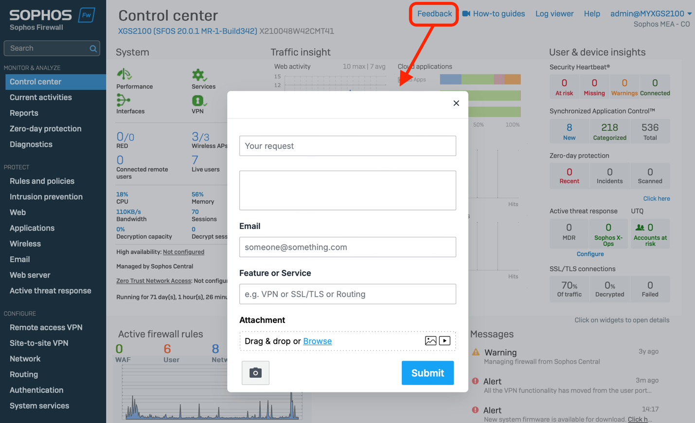 Please provide feedback using the option at the top of every screen in your Sophos Firewall as shown below or via the Community Forums.