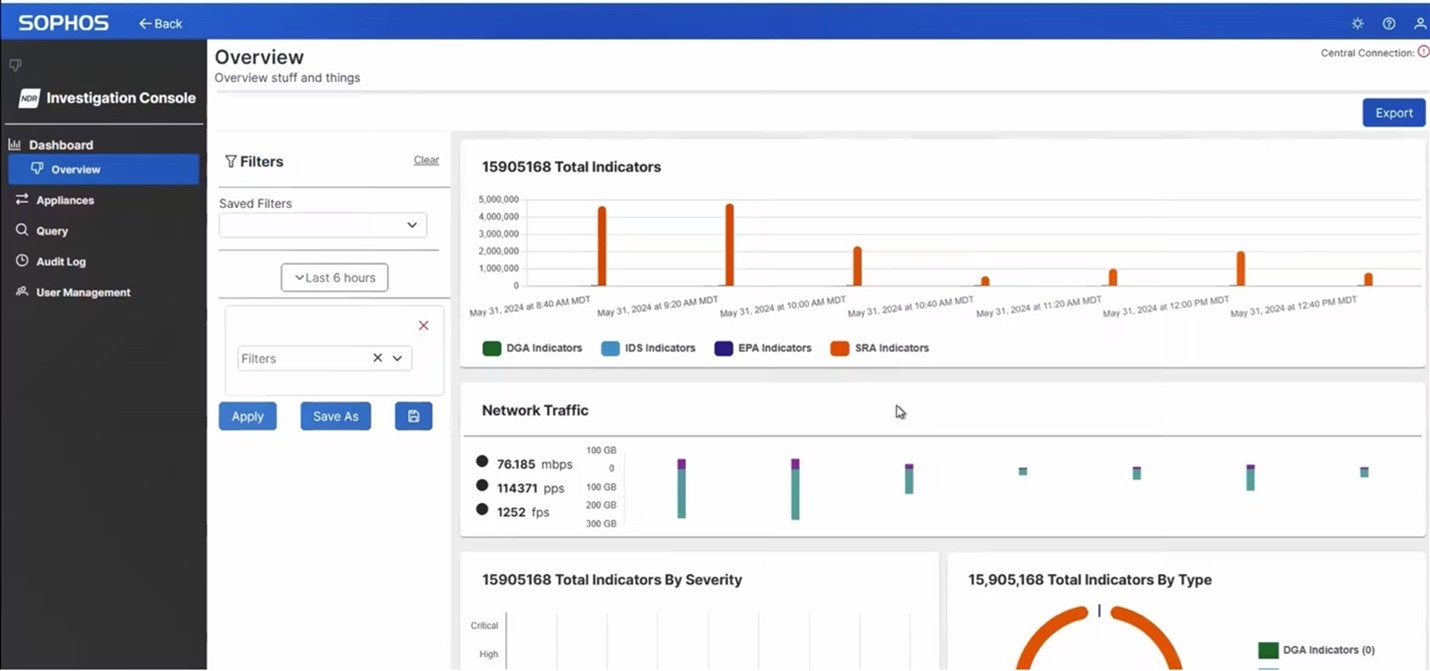 The NDR Investigation Console is designed to install on a virtual appliance on the local network and augments Sophos Central by providing deeper analysis tools on your local network, minimizing data uploads to the cloud.