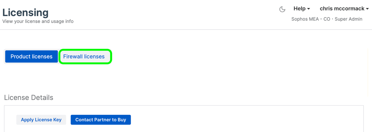 - Log in to your Sophos Central account and select “Licensing” from the drop-down menu under your account name in the top right of the Sophos Central console.