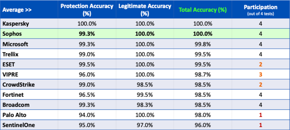 Sophos had another solid showing in the SE Labs Endpoint Protection tests for Enterprise and SMB. More important than the single test results is our continued consistency, as you can see by this summary of the four quarterly tests conducted in 2024: