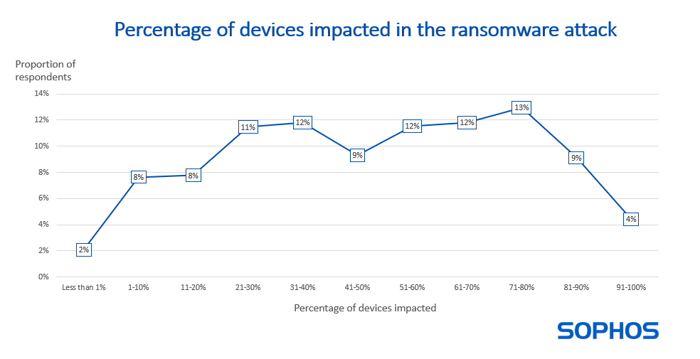 On average, just under half (49%) of an organization’s computers are impacted by a ransomware attack. Having your full environment encrypted is extremely rare, with only 4% of organizations reporting that 91% or more of their devices were impacted.